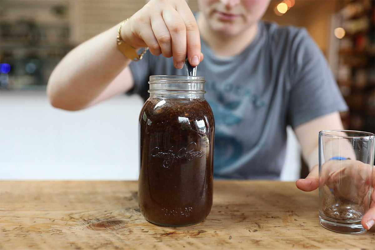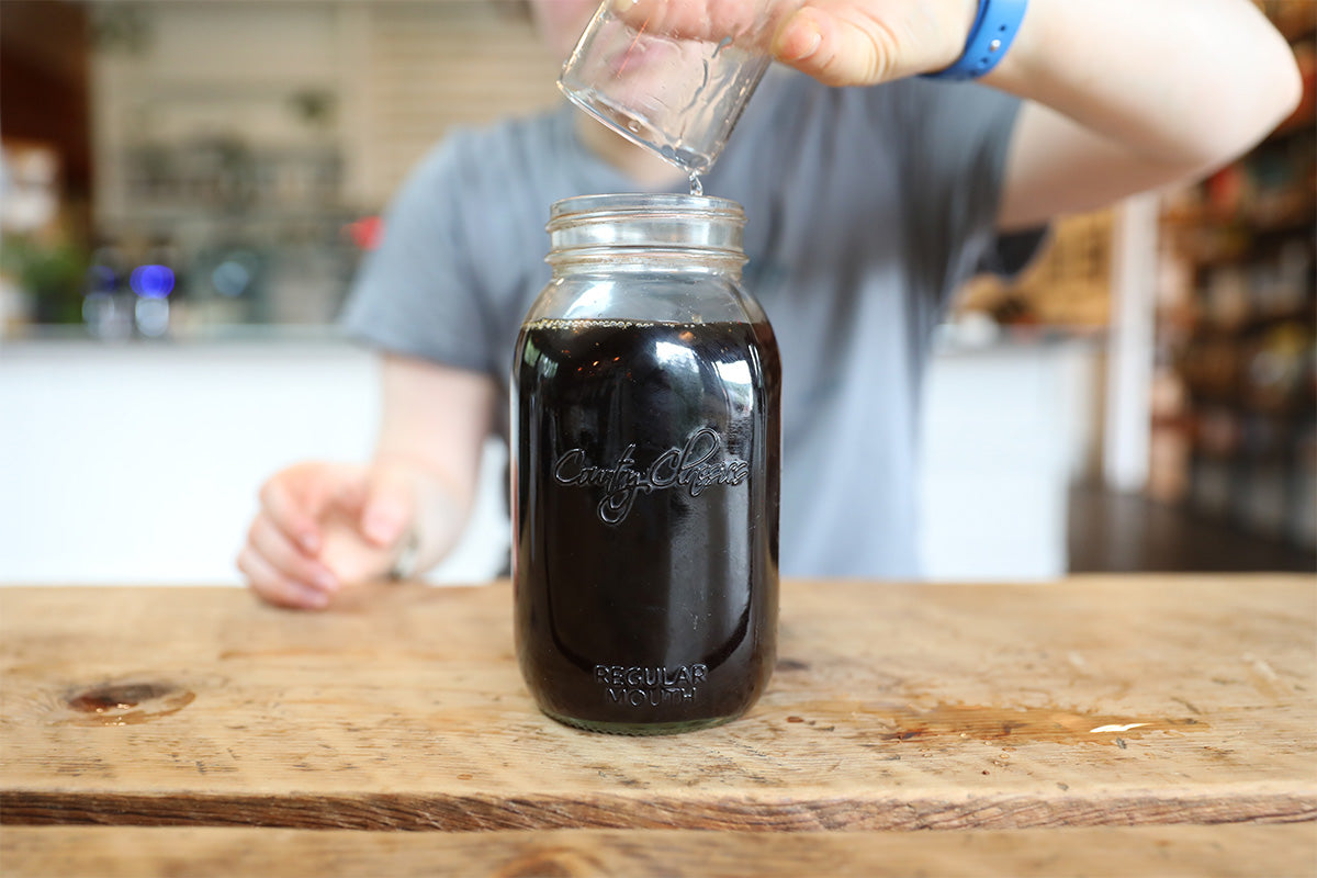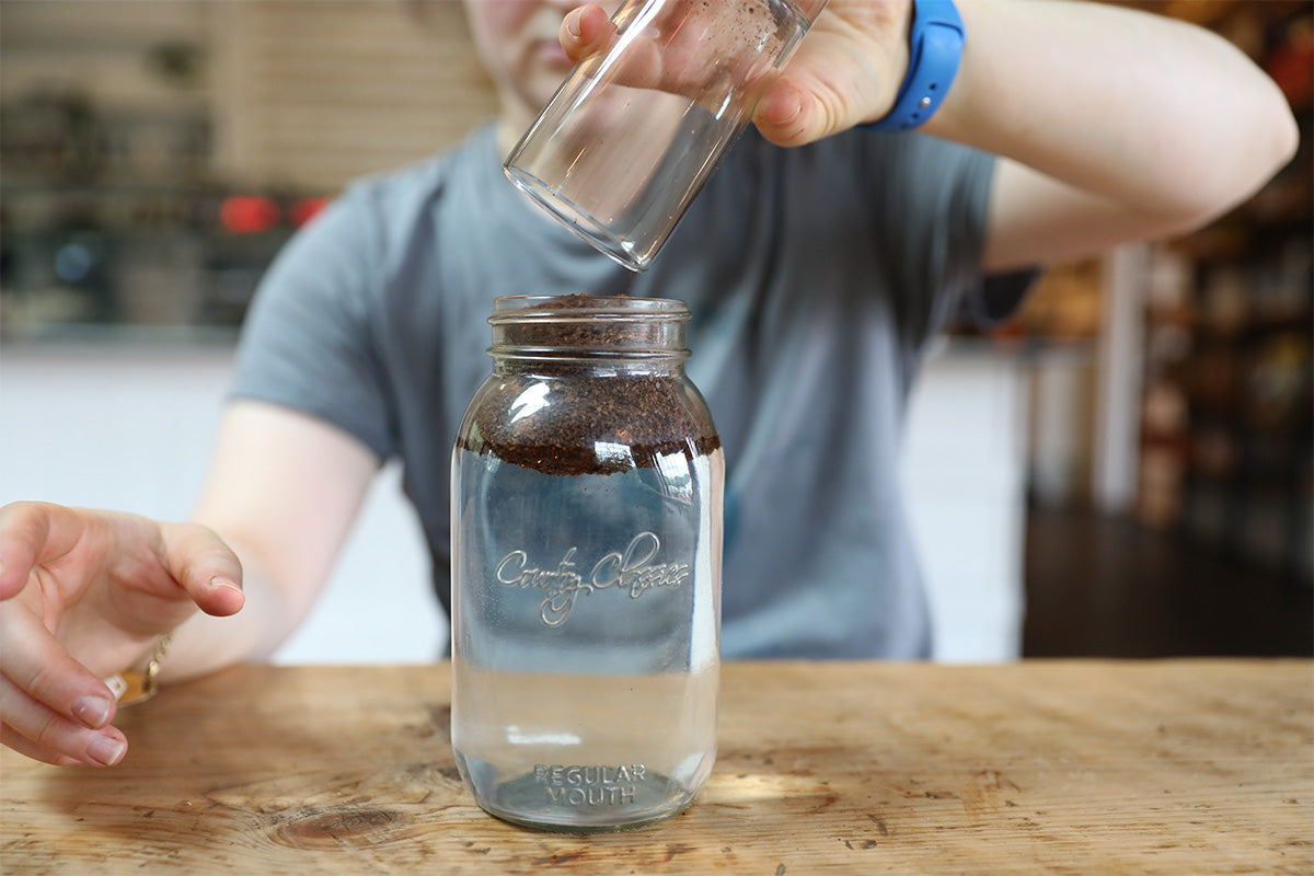 3: Stir until all grounds are in the water (it’s okay if they settle on the bottom). Cover and let sit for 18 hours on your countertop (no need to refrigerate).