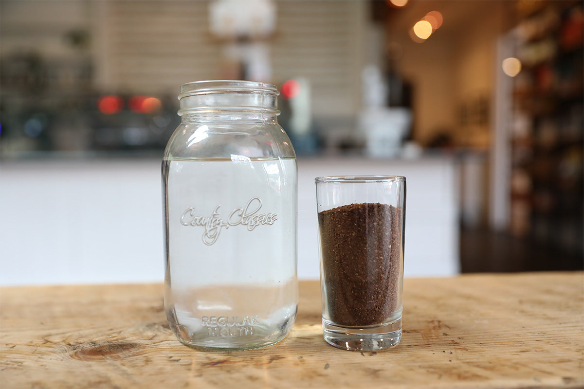 1: Grind 8 oz. of coffee course and fill a 1/2 gallon (64 oz.) Mason Jar almost full, like so, of room temperature water.